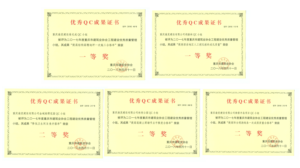 2018年4月12日,重庆市建筑业协会“2017年度建设优秀质量管理小组表彰暨成果发布会”隆重召开。重庆z6尊龙旗舰厅建设有限公司荣获“2017年度建设优秀质量管理小组”一等奖两名,二等奖三名。...
